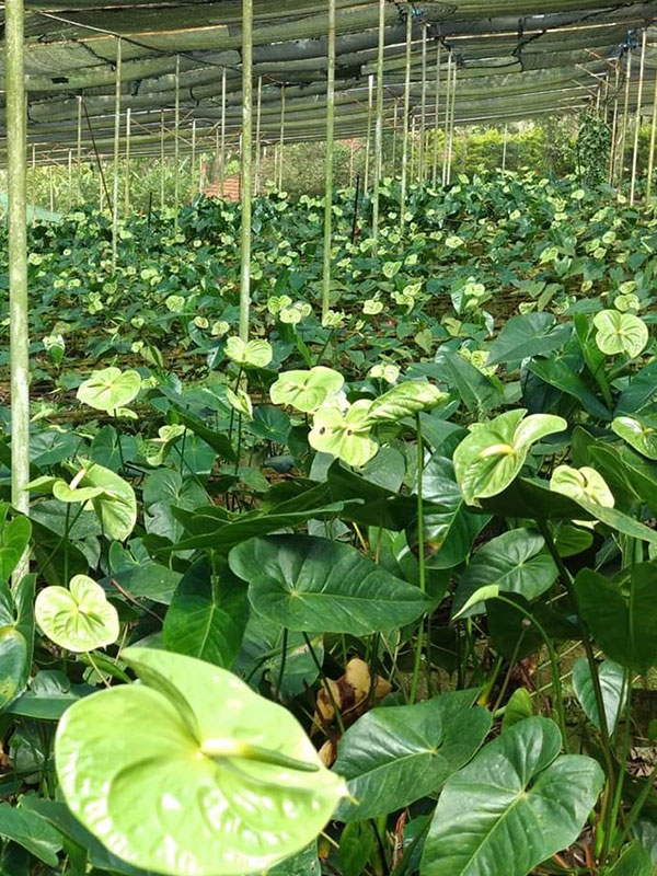 Anthuriums come in colours including pink, orange, red, green, purple, black, yellow, salmon, brown and even blue.